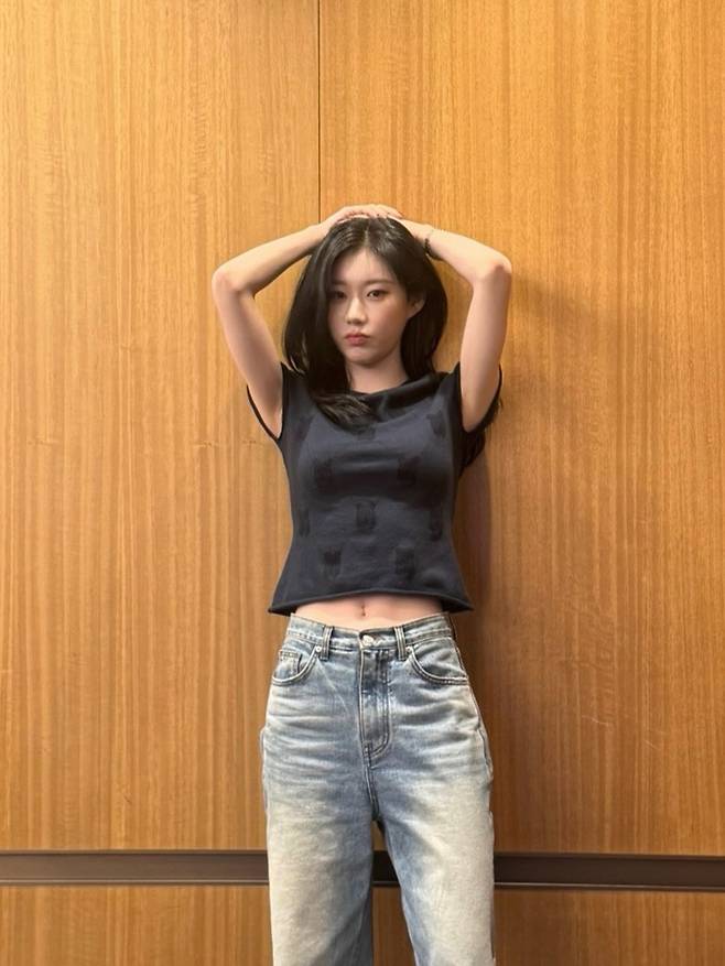 사진 속 채령은 몸에 부드럽게 밀착되는 네이비 컬러의 반소매 크롭톱에 빈티지한 워싱이 들어간 데님 팬츠를 매치해 군더더기 없는 슬림한 실루엣을 강조했는데요.