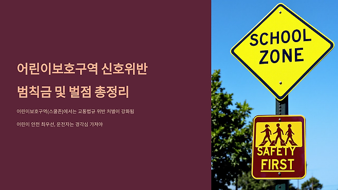 어린이들의 안전을 최우선으로 하는 어린이보호구역(스쿨존)에서는 교통 법규 위반에 대한 처벌이 일반 도로보다 훨씬 강화되어 있습니다. 특히 신호위반은 어린이들의 안전을 심각하게 위협하는 행위이므로, 운전자라면 반드시 경각심을 가지고 법규를 준수해야 합니다. 오늘은 어린이보호구역에서 신호위반 시 부과되는 범칙금과 벌점을 상세히 정리하여 운전자 여러분의 안전 운전에 도움을 드리고자 합니다.