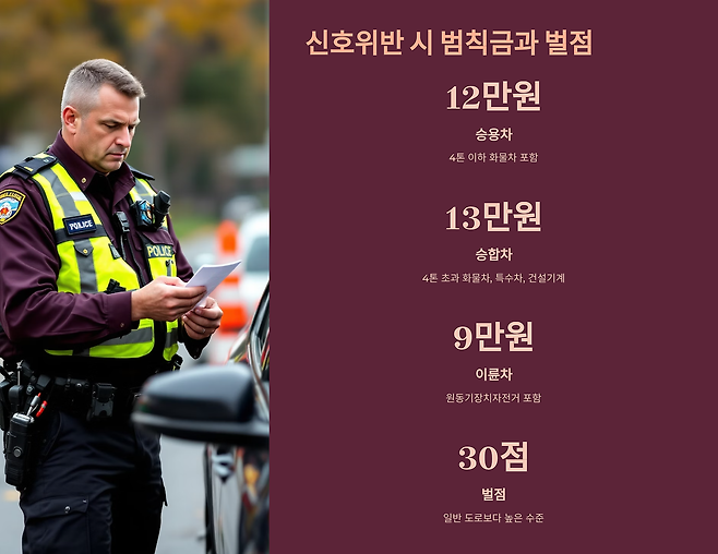 어린이보호구역에서 신호위반으로 적발될 경우, 일반 도로보다 높은 범칙금이 부과됩니다. 차종별 구체적인 범칙금 액수는 다음과 같습니다.