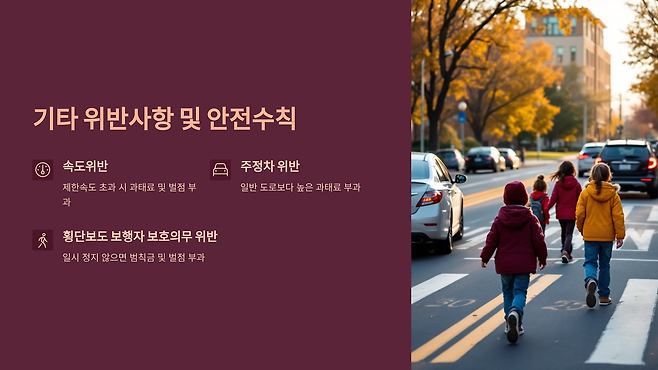신호위반 외에도 어린이보호구역 내에서는 다양한 교통 법규 위반에 대한 처벌이 강화되어 있습니다.