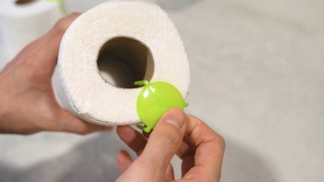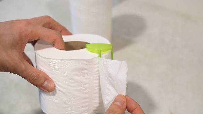 그러면 사진처럼 휴지를 단단히 고정시켜 주기 때문에 보기에도 깔끔하고 더이상 나풀거리지 않아 사용할 때 정말 좋아요. 휴지를 다 사용한 후엔 피자세이버를 계속해서 재활용해서 사용할 수 있답니다.