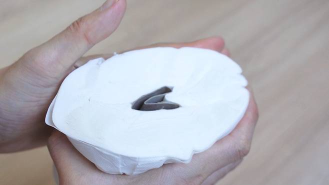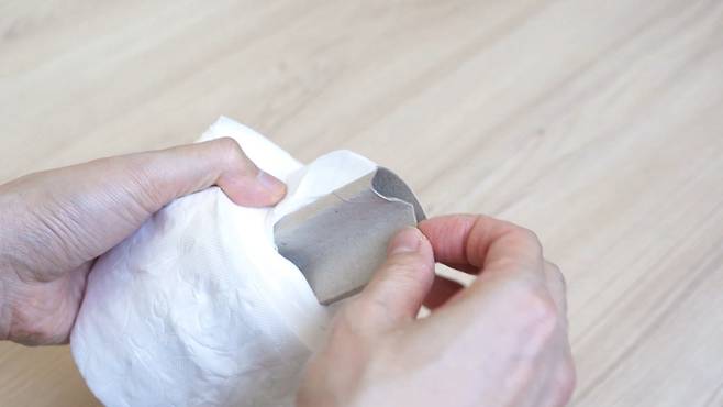 이제 말랑해진 휴지심을 손가락으로 빼주세요. 이 부분으로 휴지를 빼서 사용하면 더욱 깔끔하게 사용할 수 있는데요.