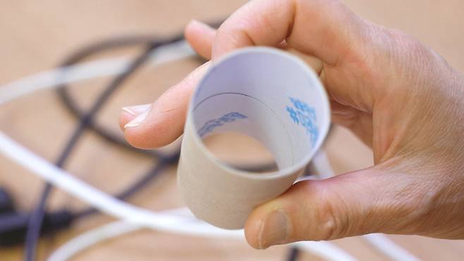 돌돌 말은 선을 모아둔 휴지심에 쏙~ 끼워 넣어 줍니다. 이렇게 하면 선이 풀리지 않고 깔끔한 상태로 유지할 수 있어 좋아요.
