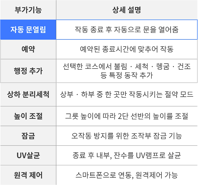 위 표는 식기세척기 부가기능 목록을 보기 쉽게 정리한 표입니다.