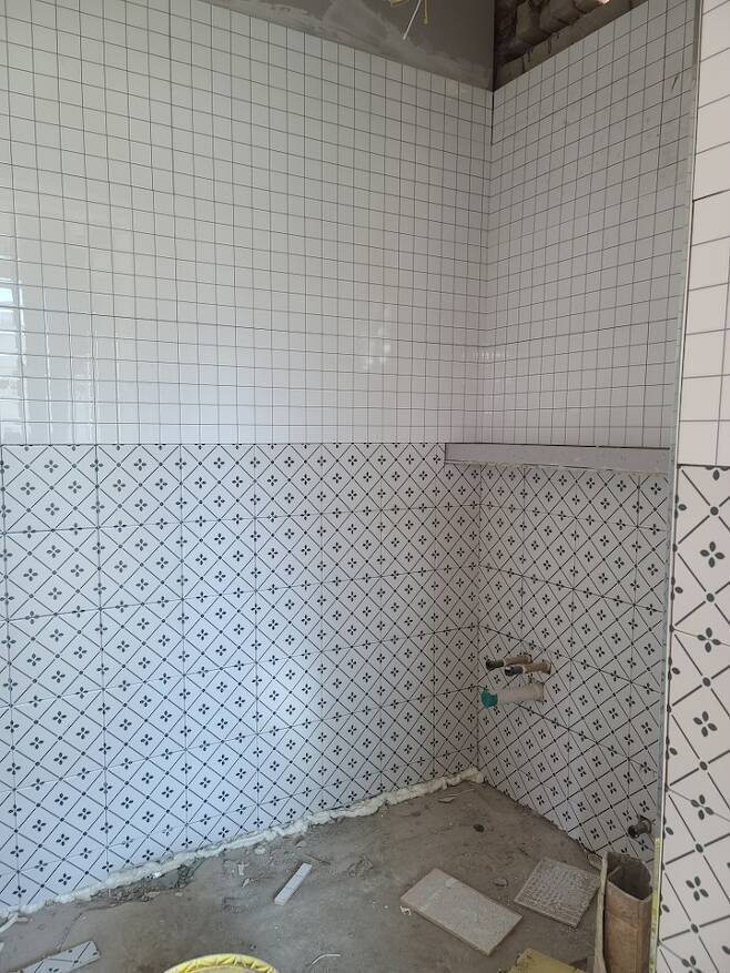 공사의 마무리 단계, 타일 공사 및 필름/샷시 작업이에요. 타일 가게에 원하는 타일이 없어서 차선책으로 다른 타일을 선택하기도 하고, 따로 구매하기도 하며 공사를 진행했어요. 타일 고르는 것도 보통 일이 아니더라고요.