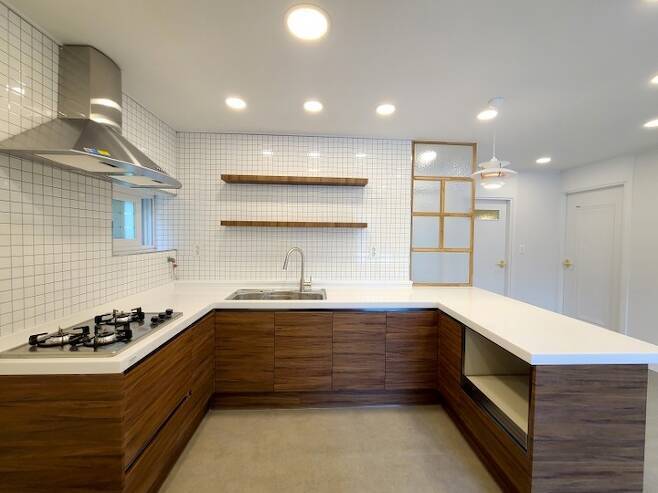 제가 원했던 주방은 상부장이 없는 화이트&우드 주방이었어요. 그래서 상부장 대신 선반을 달았고, 수납공간과 동선을 고려해 ㄷ자 형태의 주방으로 만들었어요.