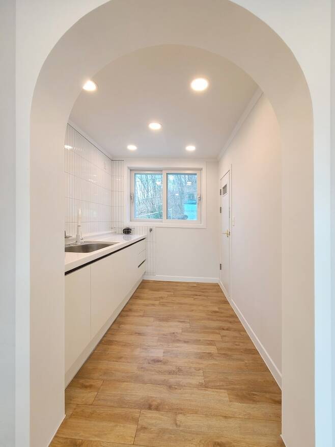아치 디자인으로 입구에 포인트를 준 주방. 깔끔하게 화이트 컬러로 톤을 맞췄어요. 2층에서는 조리를 하지 않을 예정이라 가스는 설치하지 않았어요. 수전을 화이트로 선택했더니 독특한 느낌이 드네요!