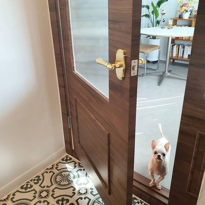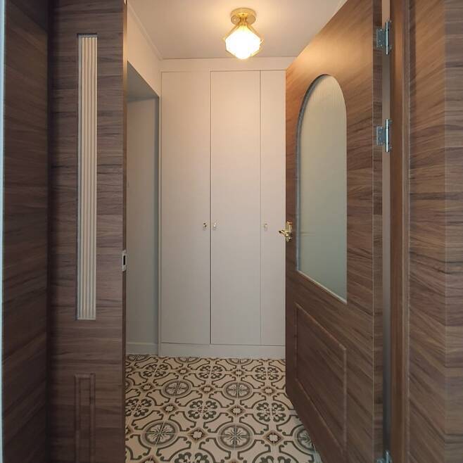 중문은 영림도어 중문이에요. 주방과 같은 필름을 시공해서 통일감을 주었어요. 예전부터 빈티지 감성의 우드 중문을 만들고 싶었는데, 집의 전체적인 분위기와 잘 맞아서 아주 마음에 들어요:)