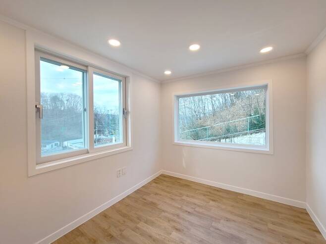 작은방의 포인트는 집 측면의 픽스 통창이에요. 창밖에 숲이 있는데, 아카시아 나무 덕분에 뷰가 좋아서 창을 크게 뚫었답니다.