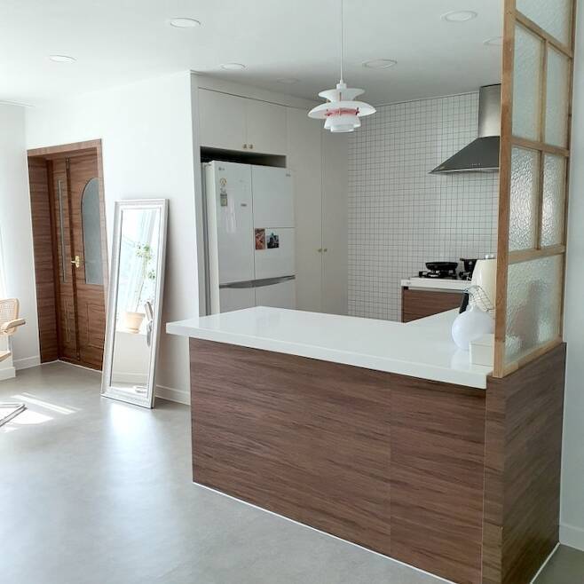 리모델링 업체에서는 필름 작업 없이 있는 그대로의 화이트를 권했지만 1층은 우드 감성을 가지고 가고 싶었기에 꼭 필름 작업을 해달라고 했어요. 결과물은 대만족 :) 원목 파티션까지 추가로 제작하니 더 감성 있는 주방이 된 것 같아요.