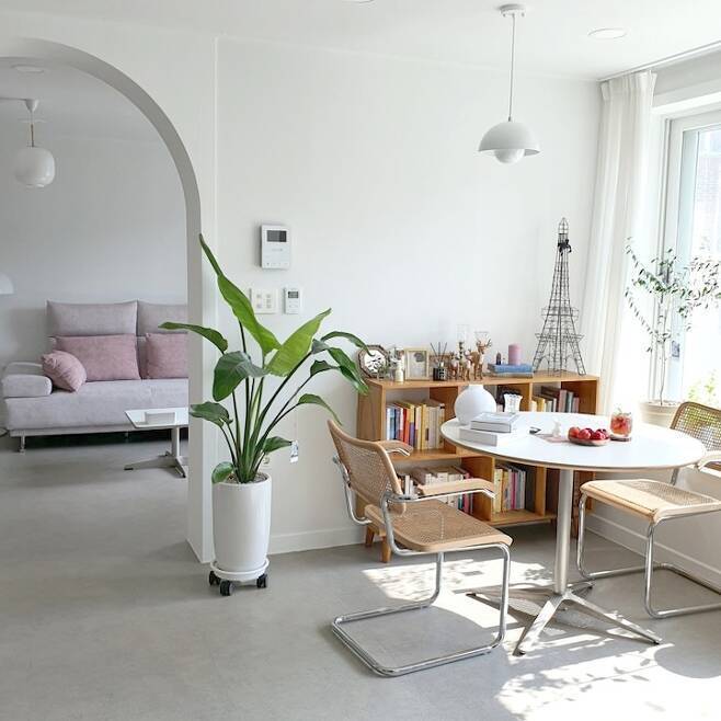 원래 있던 큰 방의 문을 없애고 아치형 입구를 만들어 개방감을 주었어요. 거실은 해가 잘 들어오는 공간이라 원형 테이블을 두고 홈카페로 이용 중이에요. 식물을 좋아해서 곳곳에 생화와 여러 화분을 두어 꾸몄답니다.