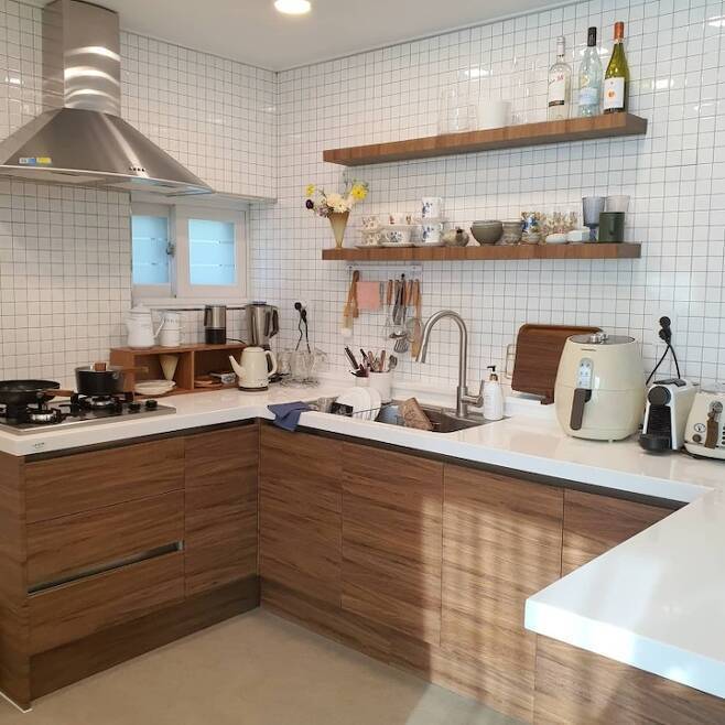 제가 원했던 주방은 상부장이 없는 화이트&우드 주방이었어요. 그래서 상부장 대신 선반을 달았고, 수납공간과 동선을 고려해 ㄷ자 형태의 주방으로 만들었어요.