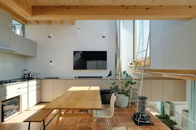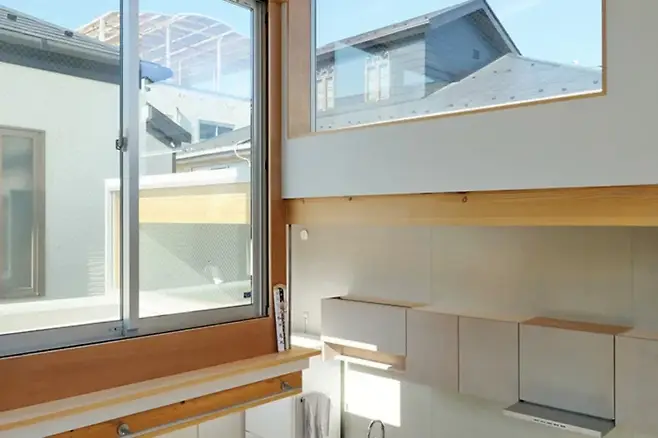 층마다 높이가 달라서 시선이 다르게 머문다. 개수대 위쪽으로 배치된 높고 큰 창문은 하늘을 향해 열려 있고, 햇살을 받아 흰 벽은 아름답게 빛난다.