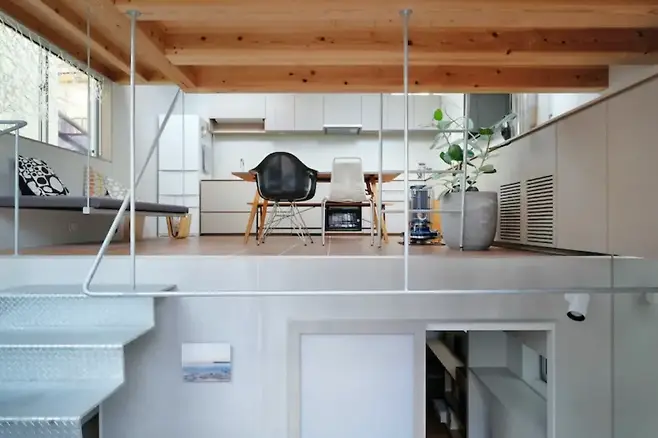 계단식 플랫폼은 집 안 동선에 흐름을 만들어주며, 자연스럽게 사적 공간과 공적 공간을 나누는 역할을 한다.