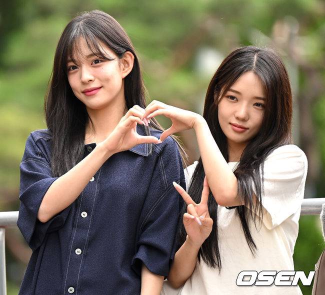 걸그룹 프로미스나인 이채영과 노지선이 녹화에 들어서며 팬들과 취재진을 향해 포즈를 취하고 있다. 2022.07.15 / dreamer@osen.co.kr