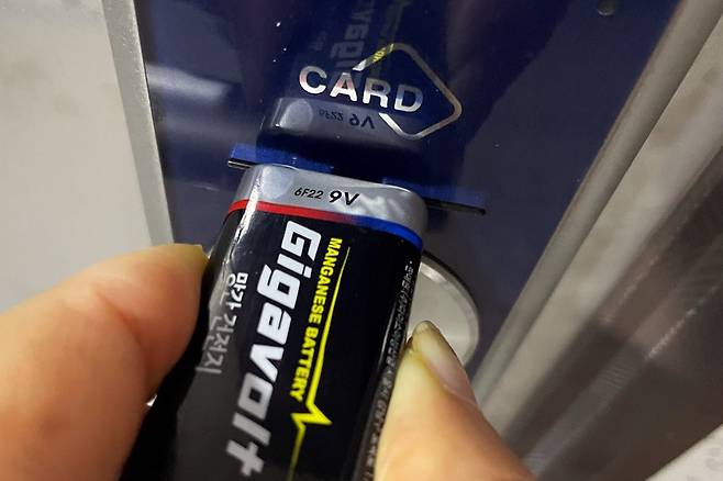 여기에 9V 망간건전지를 꾹 눌러주시면 끝입니다. 이렇게 누른다고 바로 열리는 것은 아니니 안심하시고요