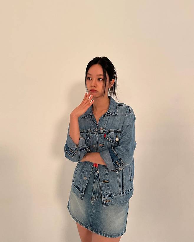 클래식한 데님 재킷과 스커트의 매치로 완성된 올 데님 스타일을 선보였다. 빈티지한 워싱 디테일의 데님 소재로 자연스러운 캐주얼룩을 연출했으며, 미니멀한 스타일링으로 데님 소재의 매력을 극대화했다.