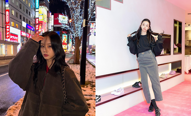 블랙 오버사이즈 스웨트셔츠와 그레이 데님 롱스커트를 매치한 모던한 스타일을 선보이고 있다. 특히 볼륨감 있는 소매 디자인과 하이웨이스트 스커트의 조화가 세련된 실루엣을 완성했다. 블랙 삭스와 스트랩 슈즈로 포인트를 주어 트렌디한 감각을 더했다.