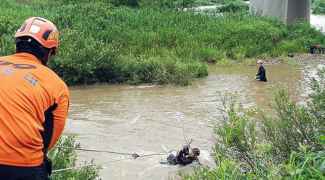 | 불어난 물에 고립된 외국인 구조 30일 오전 경기 가평군 청평면 조종천에서 119구조대원들이 로프를 이용해 자전거를 타던 중 갑자기 불어난 강물 때문에 철교 아래 고립돼 있던 외국인을 구조하고 있다. 경기북부소방재난본부 제공 |