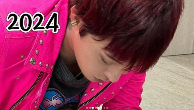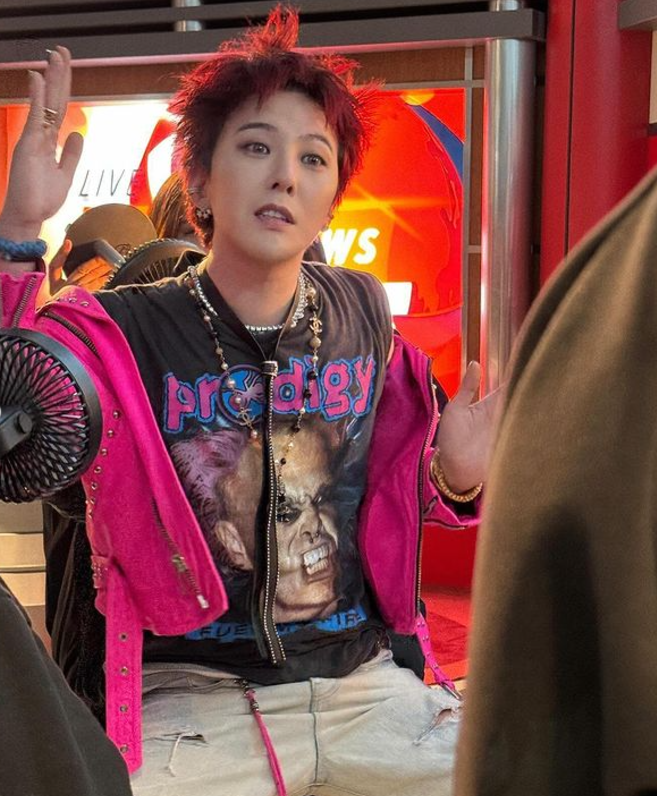 강렬한 핫핑크 컬러의 스터드 디테일의 라이더 재킷으로 펑키하고 자유로운 락스타 컨셉의 스타일링을 선보인 지디.