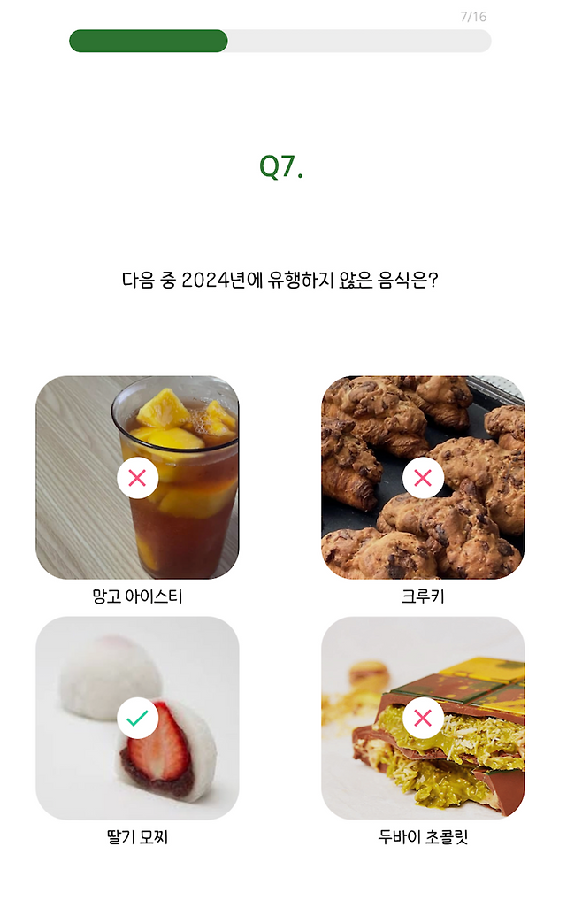유행하지 않았던 음식은 3번 딸기 모찌입니다.