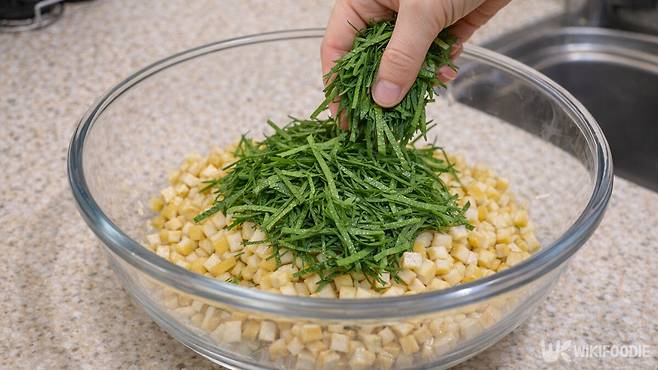 깻잎은 깨끗이 씻어 물기를 완전히 털어낸다. 한 장씩 반으로 자른 뒤 가늘게 채를 썬다. 이때 크기를 일정하게 맞춰야 반죽과 고르게 섞인다. 깻잎 줄기는 향이 진하므로 버리지 말고 잘게 다져 넣자. 깻잎 본연의 향을 훨씬 진하게 느낄 수 있다. 단, 너무 길게 썰면 반죽을 말 때 밖으로 튀어나올 수 있으니 주의한다.