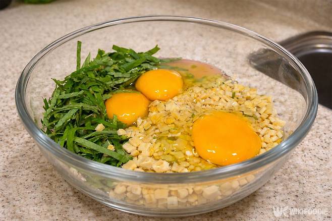 넓은 그릇에 준비한 깻잎과 어묵을 담는다. 두 재료가 한데 어우러지도록 가볍게 섞은 뒤, 달걀 3개와 밀가루 1큰술을 넣는다. 숟가락으로 충분히 저어 반죽이 너무 묽지 않게 끈기를 만든다.