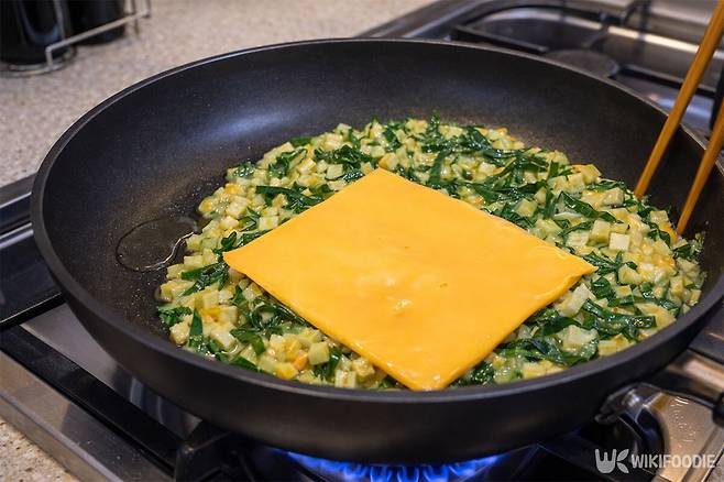 팬 아랫면이 익기 시작하면 한쪽 끝부터 조심스럽게 말아준다. 한 번 말 때마다 뒤집개로 살짝 눌러가며 모양을 잡는 것이 요령이다. 불이 세면 달걀이 금방 타버리므로, 처음부터 끝까지 약불을 유지하며 천천히 굴려 안쪽까지 익힌다. 취향에 따라 반죽 위에 체다치즈 한 장을 올려 함께 말면 고소한 풍미가 살아난다.