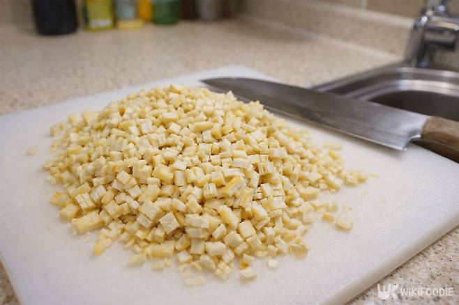 어묵도 가로세로로 잘게 다진다. 입자가 작고 고와야 반죽을 말기 편하고, 완성했을 때 식감도 일정하다.