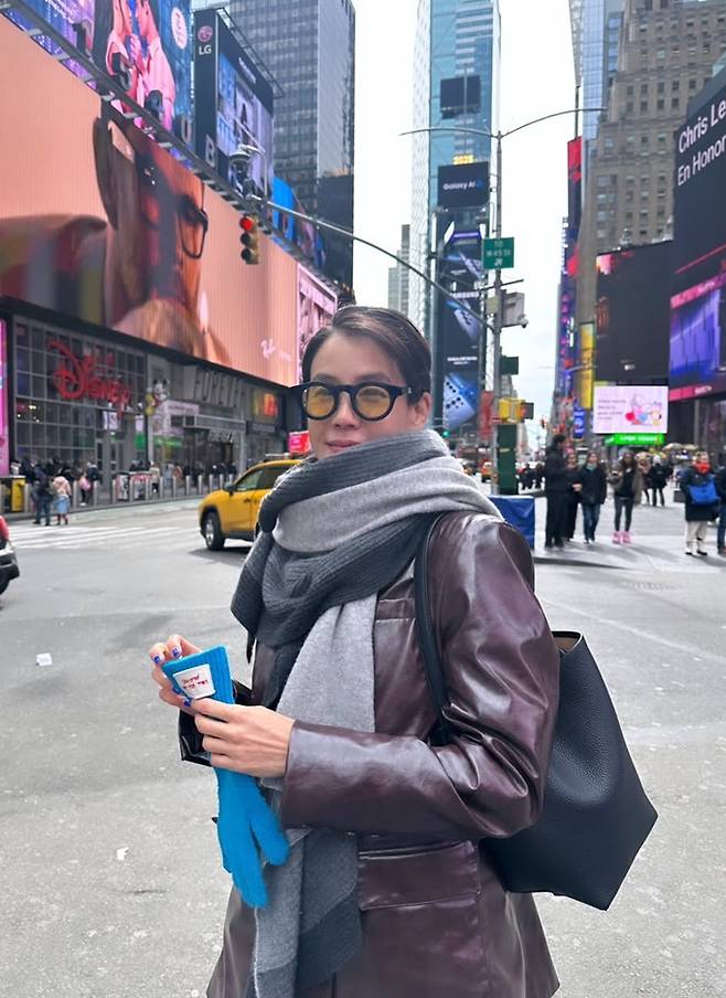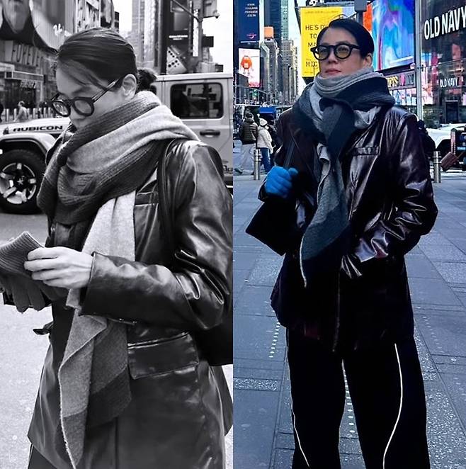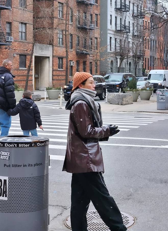 배우 김지호가 맹추위 속에 머플러에 레더 재킷의 긱시크 여행룩으로 딸과 함께 뉴욕 여행을 만끽했다.