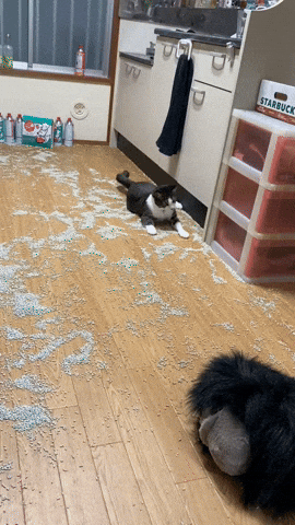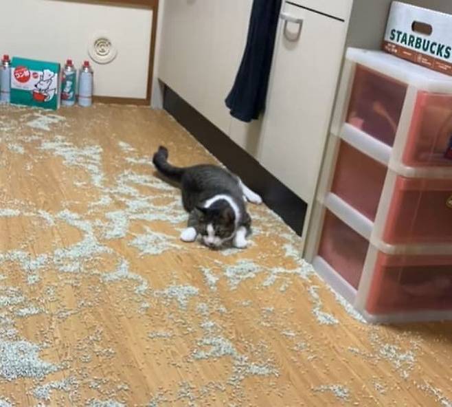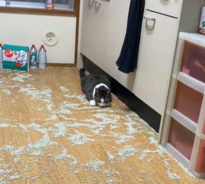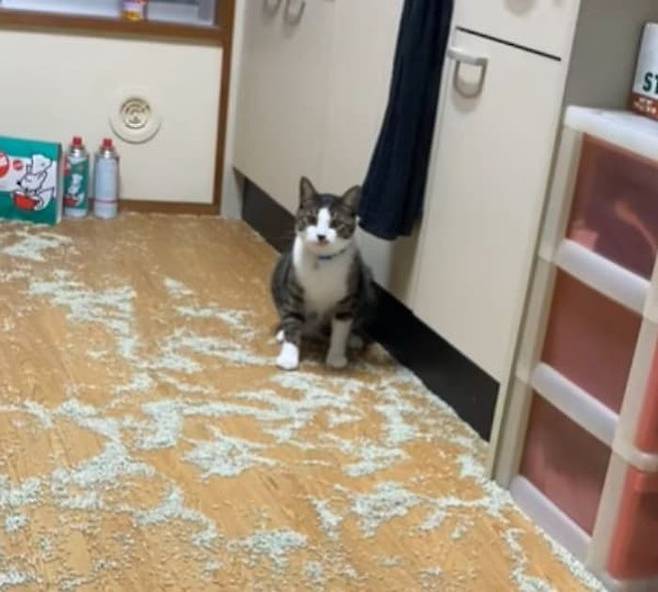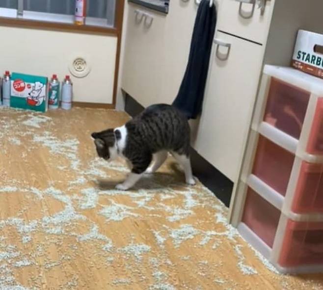 이날 일을 마치고 집에 돌아온 집사는 문을 열었다가 충격 받고 말았죠. 그도 그럴 것이 집안이 온통 고양이 화장실 모래로 엉망이 되어 있었던 것이 아니겠습니까.