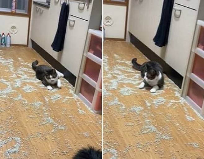 집안에 모래 폭탄을 투척한 고양이는 집사가 집에 들어왔는지도 모른 채 바닥에 떨어진 모래를 가지고 신나게 놀고 있었죠.