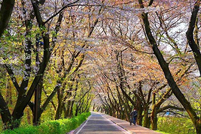 농사용 수로를 따라 조성된 이 길은 명활산성과 진평왕릉을 잇는 오솔길로, 약 2km 남짓 이어지는 작은 뚝방길이지만 봄이 되면 벚꽃이 길을 따라 흐드러지게 피어나 환상적인 풍경을 연출합니다.