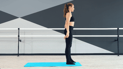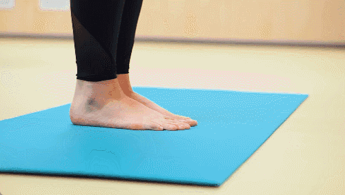 매트 위에 똑바로 서서 양발은 골반 너비로 벌리고 준비합니다. 균형 잡기 어렵다면 벽이나 의자 앞에 서서 손으로 가볍게 짚어주세요. 양발의 발꿈치를 동시에 들어 올려 까치발이 되었다가 천천히 내려옵니다.