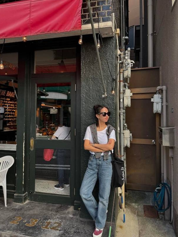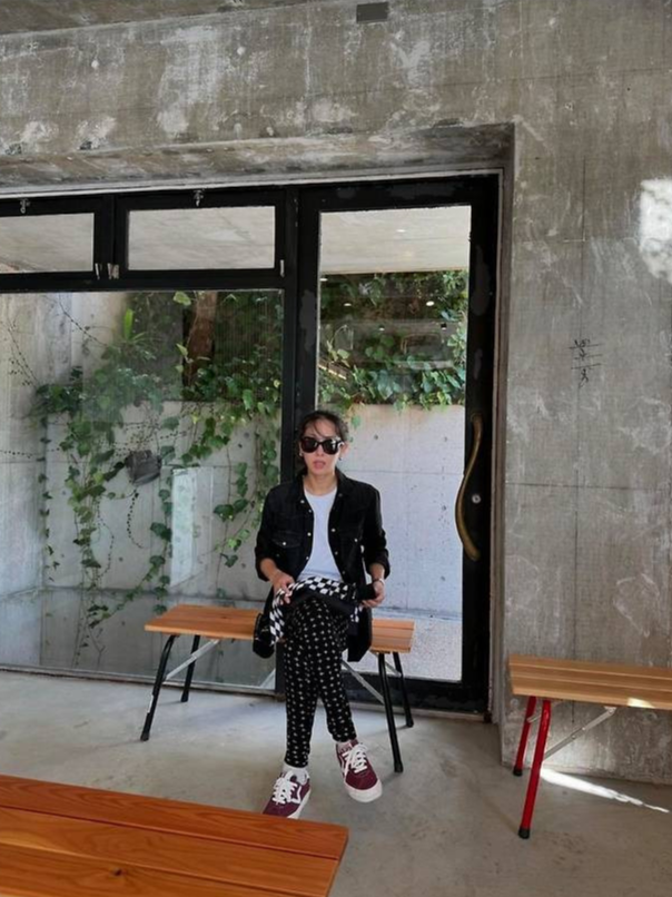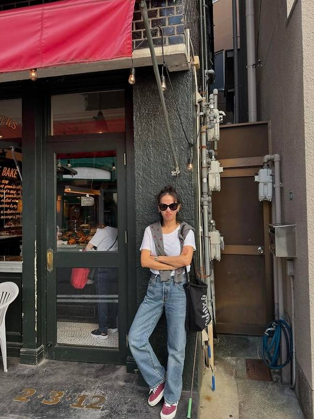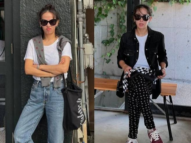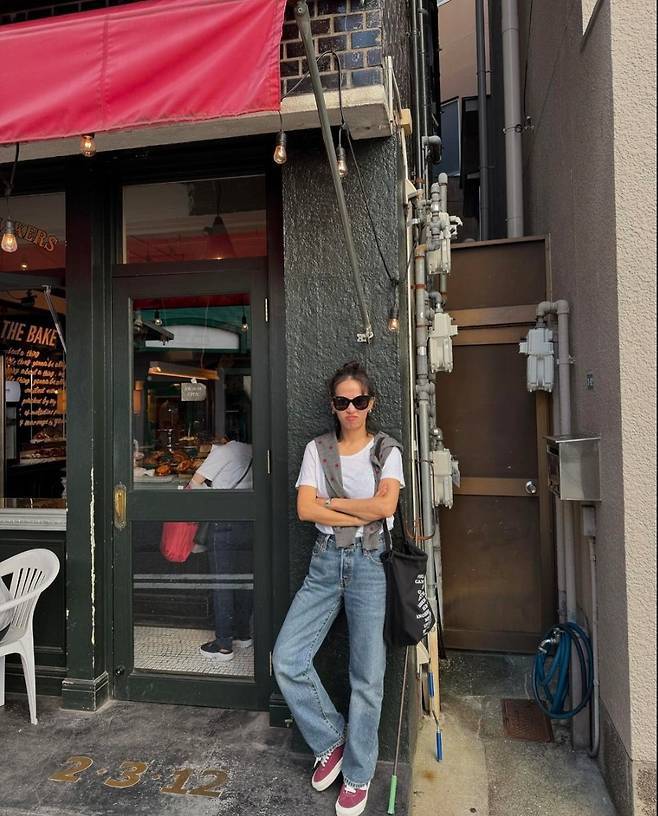 또 다른 사진에서 조여정은 화이트 티셔츠와 청바지를 착용하고 빨간 도트무늬가 돋보이는 회색 숄을 걸쳐 캐주얼하면서도 스타일리시한 포인트를 주었습니다.