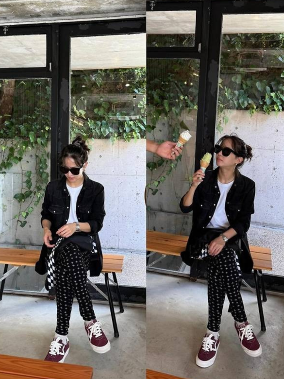 조여정은 화이트 티셔츠 위에 블랙 데님 재킷을 걸치고 화려한 패턴의 팬츠를 매치해 유니크하면서도 멋스러운 패션을 자랑했습니다.