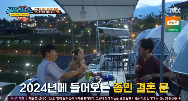 이날 김종민은 다과 파티를 즐기며 신지에게 "너 내년에 결혼한다고 하지 않았냐"고 물었다.