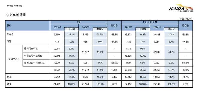 내연기관 차량은 감소폭이 더 컸다. 가솔린 차량은 4월 3680대로 전년보다 33.5% 줄었고, 디젤은 412대로 37.2% 감소했다. 디젤은 전체 수입차 연료 중 가장 낮은 비중인 1.9%에 머물렀다. 특히 유럽 브랜드를 중심으로 내연기관을 MHEV로 전환하는 추세가 강해지면서 순수 내연기관 비중은 더욱 줄어들 전망이다. 벤츠, BMW, 아우디 등은 기존 가솔린·디젤 차량을 대부분 48V 마일드하이브리드 시스템으로 대체하고 있다.