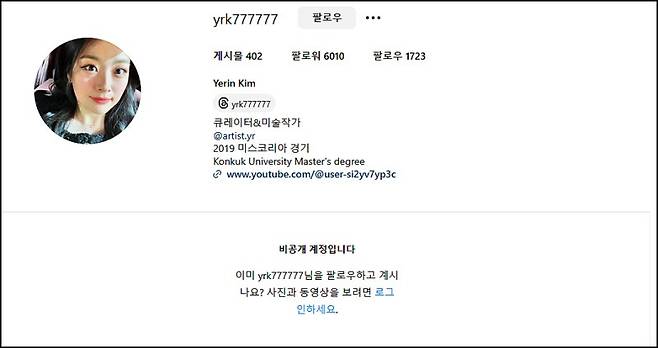 미스코리아 출신 여자5번 김예린의 인스타는 @yrk777777 이래! 하지만 지금은 아쉽게도 비공개 상태… 😭 스레드랑 유튜브도 비공개라니… 너무 궁금한데!! 😫 혹시 풀리면 바로 달려가서 구경해야지! 🏃♀️