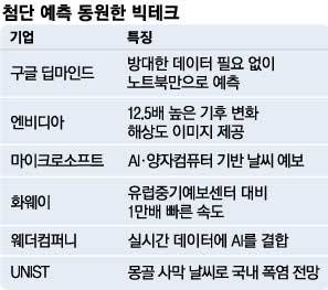 국내에서도 시도는 이어지고 있다. 울산과학기술원(UNIST) 지구환경도시건설공학과 임정호 교수팀은 해수면 온도, 토양 수분, 적설 깊이, 해빙 농도 등 전 세계 기후 요소들을 분석해 폭염 예측 AI 모델을 개발해 주목을 끌었다. 이를 통해 몽골 사막과 중국 톈산산맥의 적설 깊이가 국내 폭염일수 예측에 중요한 요소라는 점이 확인됐다. 쌓인 눈이 줄어들면 국내 여름 기온이 상승한다는 패턴을 파악한 것이다.