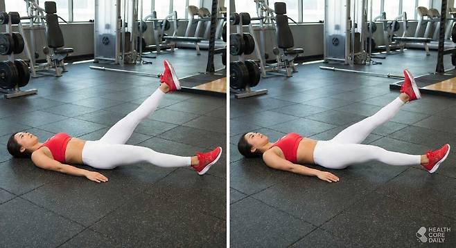 준비 자세가 됐다면 한쪽 다리를 바닥에서 약 30~45도 각도로 들어 올리고, 반대쪽 다리는 더 낮은 위치에 둔다. 두 다리가 동시에 공중에 떠 있어야 한다. 이 상태에서 다리의 위치를 바꿔 번갈아 교차하는 동작을 수행한다. 발목은 움직이지 않도록 고정한 채 허벅지와 종아리를 전체적으로 이용해 다리를 위아래로 천천히 움직인다. 무릎은 구부러지지 않도록 유지한다. 상체는 살짝 들고 시선은 천장을 바라본다.