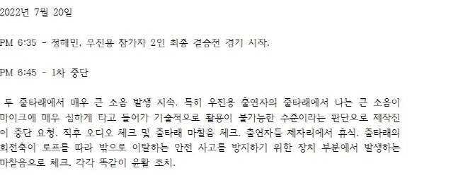 논란이 확산되자 제작진은 ‘스포츠서울’에 당시 오디오파일에 근거한 타임라인을 공개했다. MBC가 공개한 타임라인에 따르면 줄타래 소음 문제로 1차 경기가 중단됐고 줄타래에서 풀린 밧줄이 회전하던 줄타래 줄과 엉키는 문제로 다시금 경기가 중단됐다. 제작진은 중단시간이 길어질 경우 경기 결과에 영향을 미칠 수 있다는 판단 하에 두 출연자에게 사과와 양해를 구했다고 전했다.