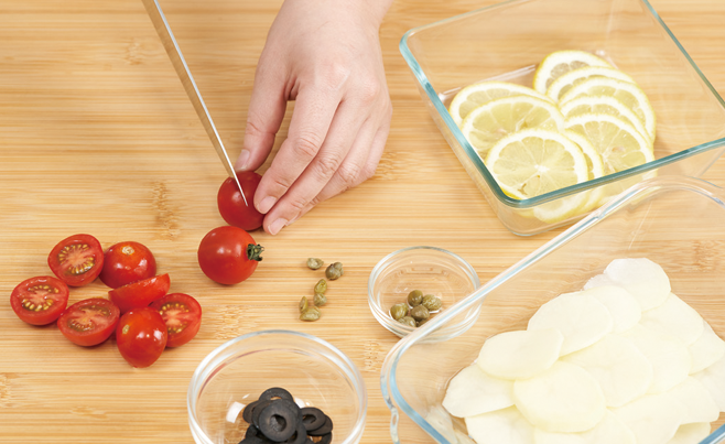1) 감자, 레몬, 블랙 올리브, 케이퍼는 얇게 썰고, 방울토마토는 반으로 잘라 놓는다.