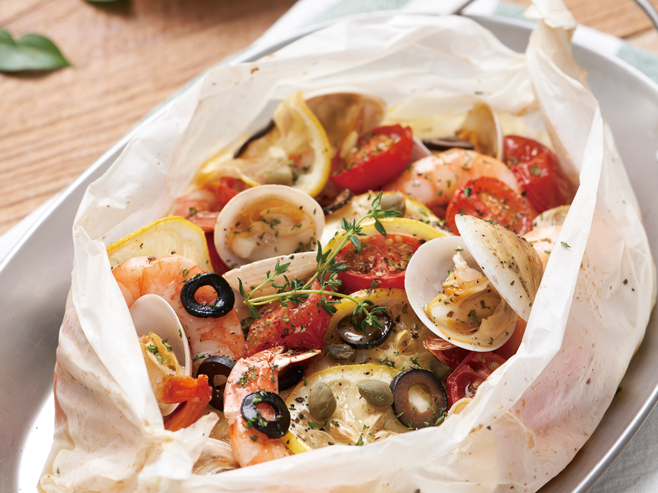 재료(2인분): 농어(또는 광어) 200g, 새우(中) 8마리, 모시조개 10개, 감자 1개, 레몬 1개, 블랙 올리브 3개, 방울토마토 6개, 케이퍼 5개, 버터 2T, 화이트와인 1/2컵, 사각 버터 10g, 올리브오일 스프레이, 소금·다진 생파슬리 1T씩, 후춧가루 1t, 유산지(오븐 용기에 넉넉히 깔고 양끝이 접힐 정도 크기)