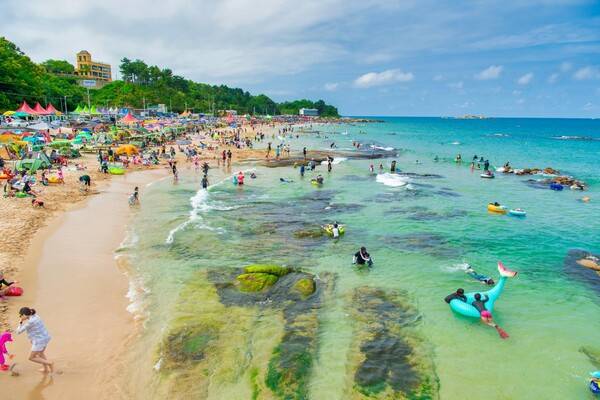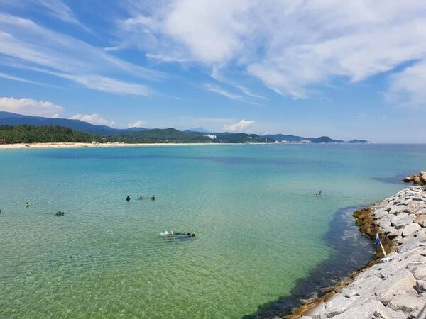 여름철 고운 모래와 함께 해수욕과 물놀이를 즐기기 좋고 기암괴석과 해안 절벽을 따라 걷을 숭 있는 덕봉산 해안탐방로도 있어 물놀이와 트레킹까지 함께 즐길 수 있는 동해안 해수욕장으로 추천드립니다.