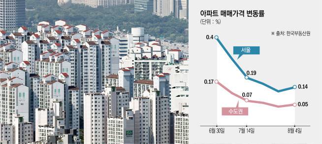 13일 한국부동산원 8월 첫째주 주간 아파트 가격 동향에 따르면 6·27 부동산 대출 규제 이후 주춤하던 서울 아파트 매매가격은 6주 만에 다시 전주 대비 상승폭(0.12 → 0.14%)이 커졌다. 수도권 주택담보대출 6억 원 제한을 골자로 한 규제가 단기간 약발이 들었지만, 장기 효과는 내지 못한 것이다.