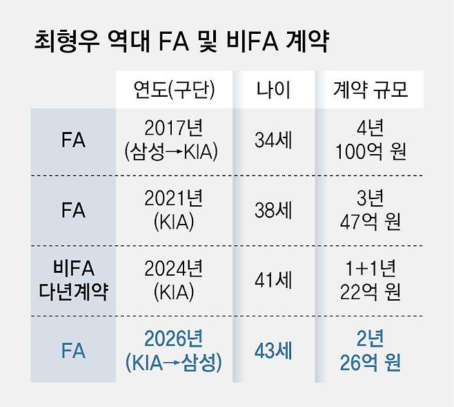 2016년 삼성을 떠나며 한국프로야구 최초로 자유계약선수(FA) 100억 원 시대를 열었던 최형우(42)가 세 번째 FA 계약을 맺으며 9년 만에 친정팀으로 복귀한다.