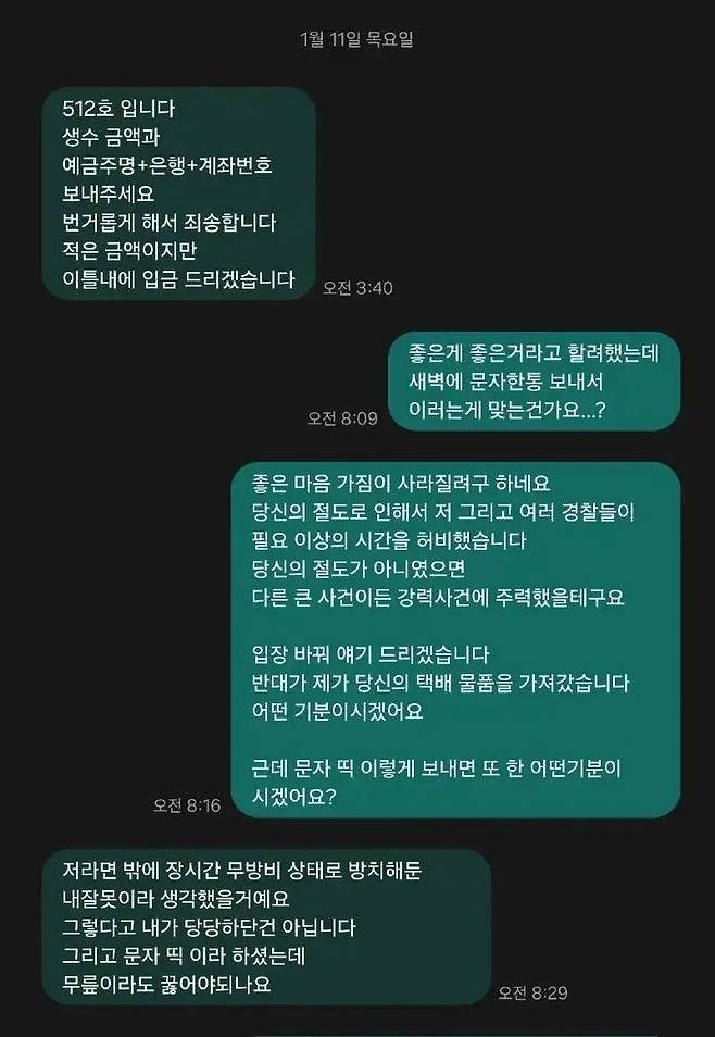 택배로 온 생수 훔쳐간 절도범이 새벽에 보낸문자