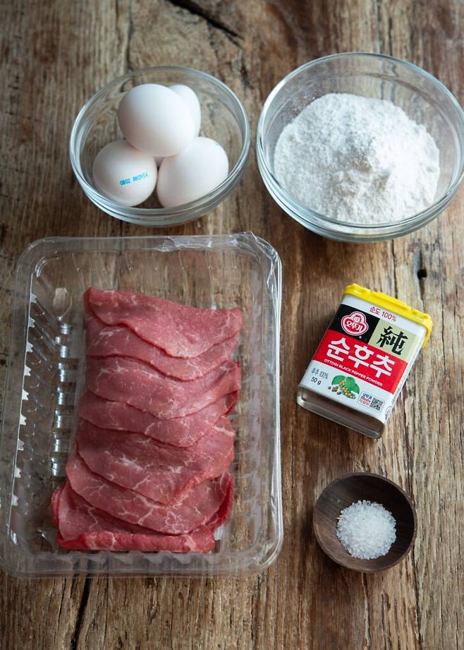 소고기(등심이나 설도, 얇게 썬 것) 300g, 소금·후추 약간, 밀가루 1/2컵, 달걀 4개, 식용유 3큰술