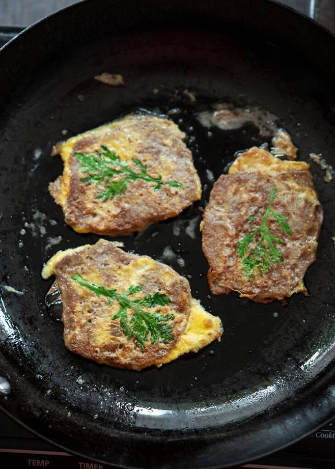 5. 한 면을 1~2분 정도 굽다가 뒤집어 다시 1분간 노릇하게 지진다.